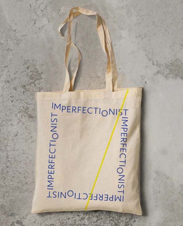 背面以“不完美主義者”的英文“IMPERFECTIONIST"為主視覺元素,藍色字母搭配象征光線的明黃色線條,