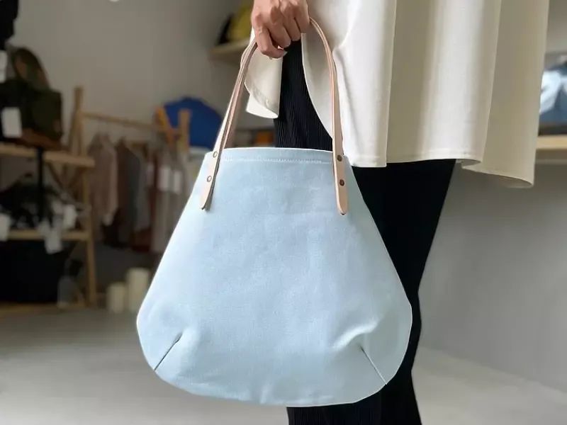 這款水藍色的圓形帆布袋形狀很可愛、有趣,底部設計有折痕,袋子放入物品之后會變個更加立體、圓潤。此外,采用了厚實的帆布和皮革提把搭配,堅固又耐用,尤其皮革處還會隨著時間變得更有手工得美感,不管肩背或手提都很適合喔!